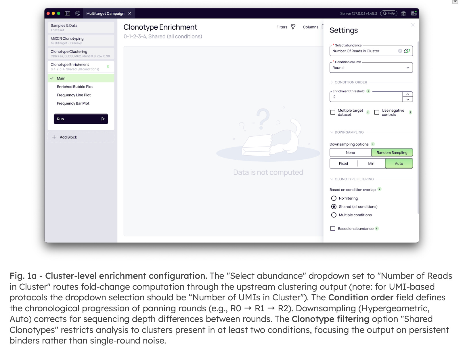 Analysis begins by linking directly to the cluster-level abundance generated upstream. By aggregating the signal across sequence variants within a single lineage, the platform recovers rare binders that might otherwise fall below the detection threshold if analyzed individually. The workflow automatically accounts for the chronological progression of panning rounds, normalizes for sequencing depth differences via downsampling, and filters for persistent binders to eliminate single-round noise (Fig. 1a)