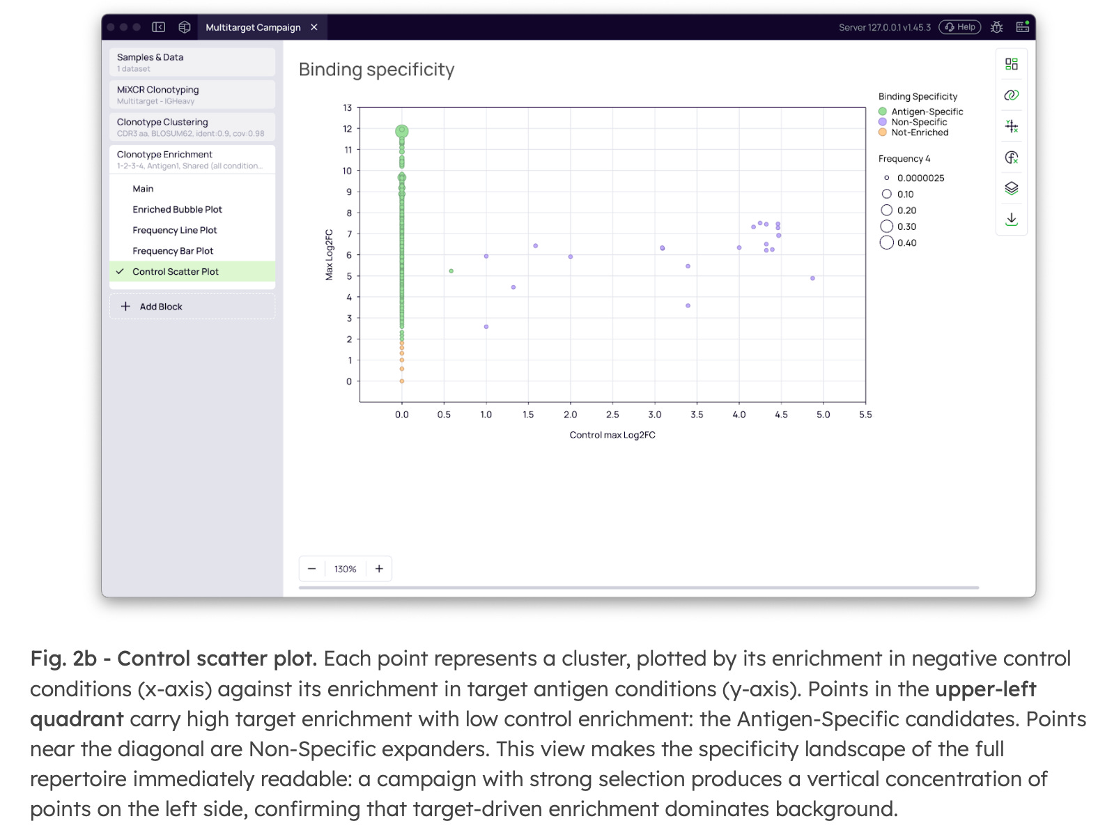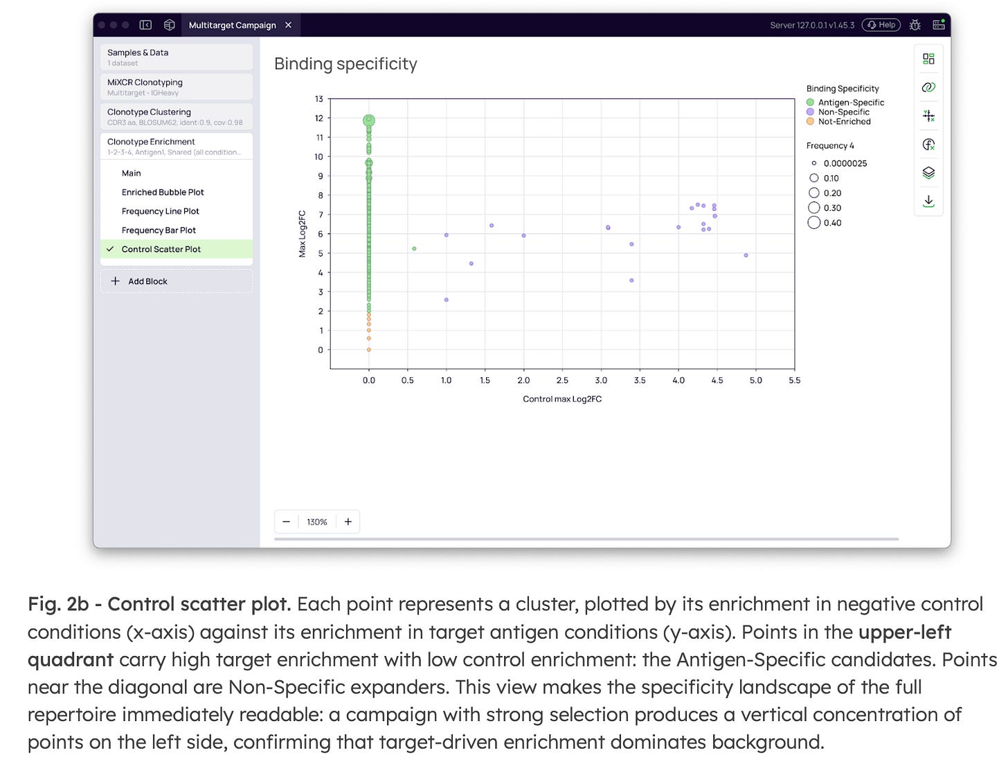 These labels are exported as structured columns, immediately available for downstream lead selection. Furthermore, this data generates a Control Scatter Plot (Fig. 2b) that makes the specificity landscape of the full repertoire instantly readable. Antigen-specific candidates isolate cleanly into the upper-left quadrant (high target enrichment, low control enrichment), while non-specific expanders track predictably along the diagonal