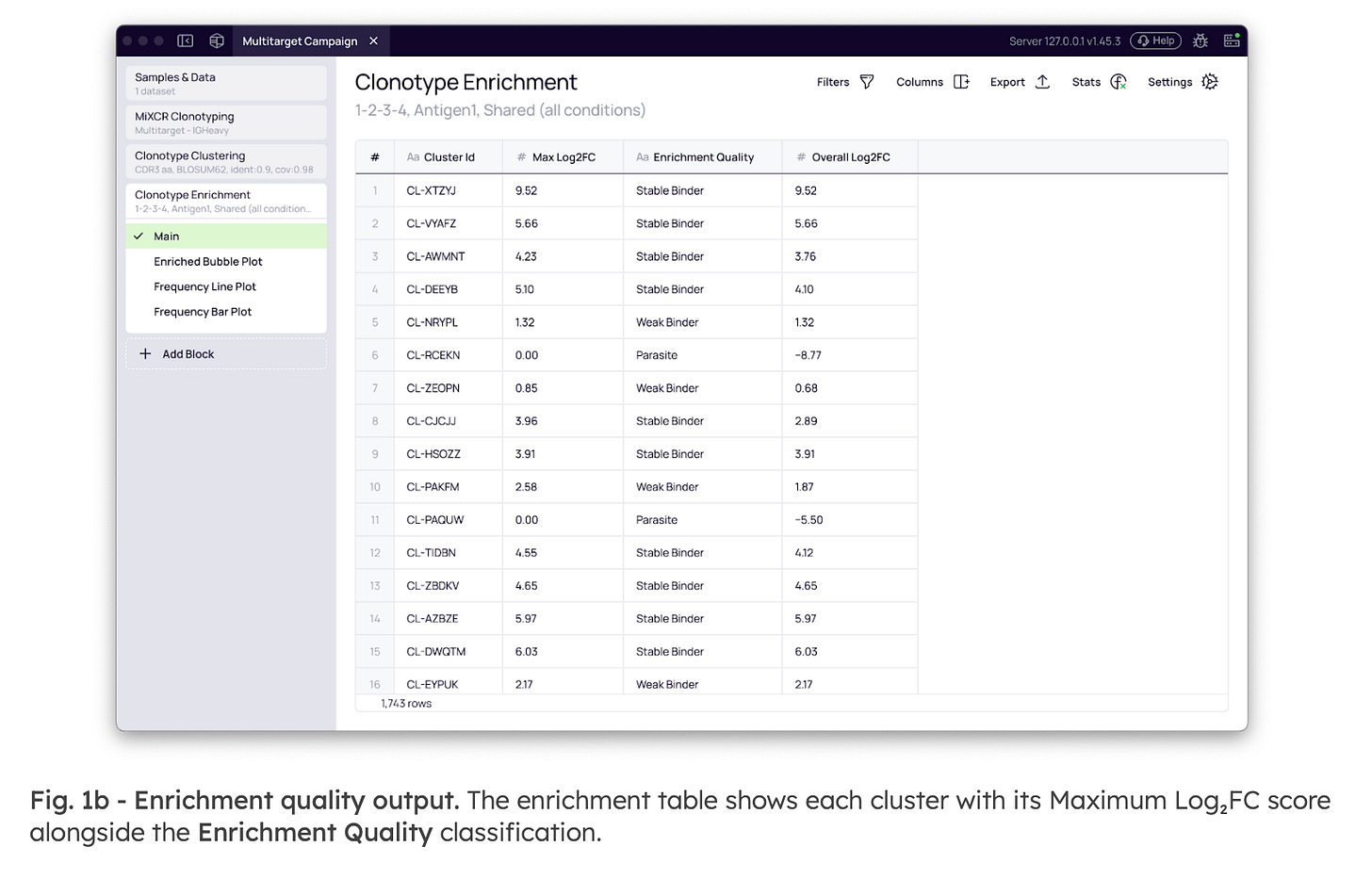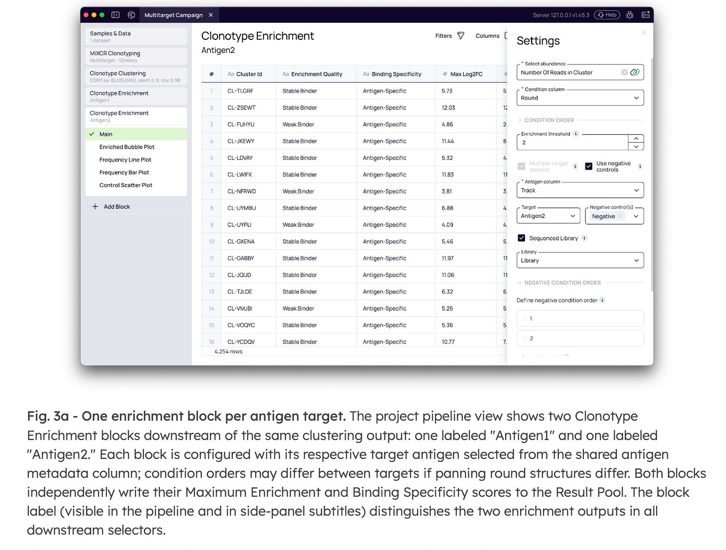 By running parallel Clonotype Enrichment analyses for each target antigen within the same project, the platform independently calculates enrichment scores and specificity classifications for each target (Fig. 3a). Because these parallel analyses feed into a unified data environment, the Lead Selection step can query multiple enrichment profiles simultaneously (Fig. 3b).