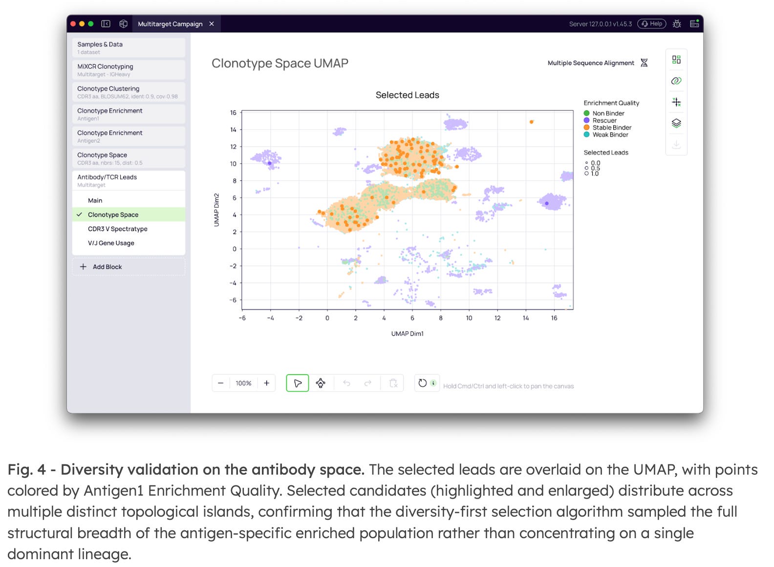 The final selected leads are overlaid on the UMAP projection of the full repertoire, colored by Binding Specificity from each enrichment block. Monospecific candidates occupy distinct topological regions from cross-reactive clusters, providing spatial confirmation that the selection criteria isolated the intended specificity profile. The combination of Enrichment Quality, Binding Specificity, and cross-antigen filter settings converts what was previously a manual, multi-step analytical process into a single, reproducible configuration within one project.