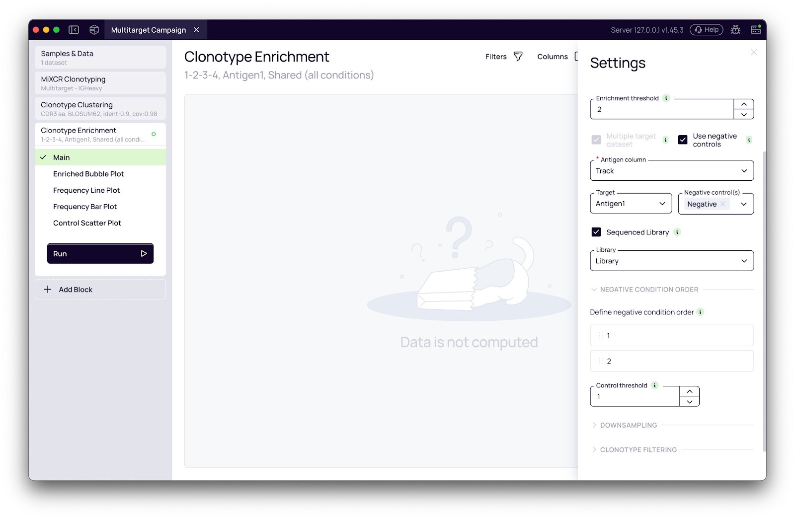 Fig. 2a - Antigen and negative control configuration. The “Target selection” section activates binding specificity analysis. The Antigen column dropdown selects the metadata column mapping each sample to its antigen. The Target antigen dropdown identifies which value represents the selection target; the Negative controls multi-select captures the irrelevant antigens used as specificity references (e.g., BSA, Plastic). The condition order for control rounds is specified independently of the main target condition order, supporting campaigns with different round structures for target and control pannings.