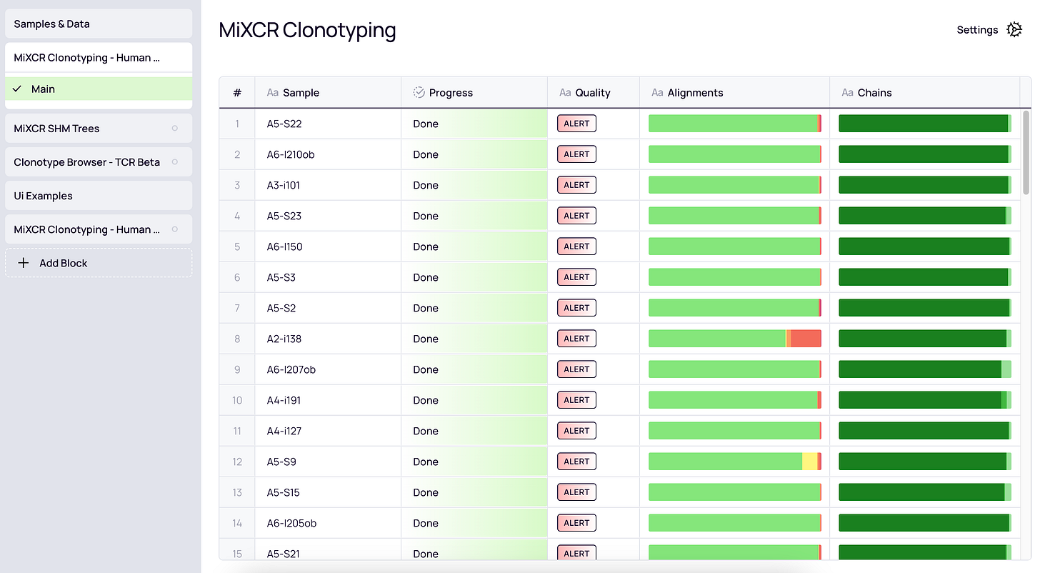 Performing secondary analysis on 10x Genomics Universal 5’V(D)J data often requires the use of multiple tools and coding proficiency. However, using MiXCR on Platforma streamlines the entire process, including secondary analyses, into drag-and-drop blocks. Use dedicated presets for 10x Genomics: mixcr analyze 10x-sc-xcr-vdj or mixcr analyze 10x-sc-xcr-vdj-v3, making analysis simple and accessible even to those without coding skills.