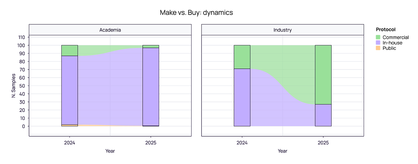 One of the most striking findings in our 2025 data is the “Make vs. Buy” polarization between Academia and Industry.