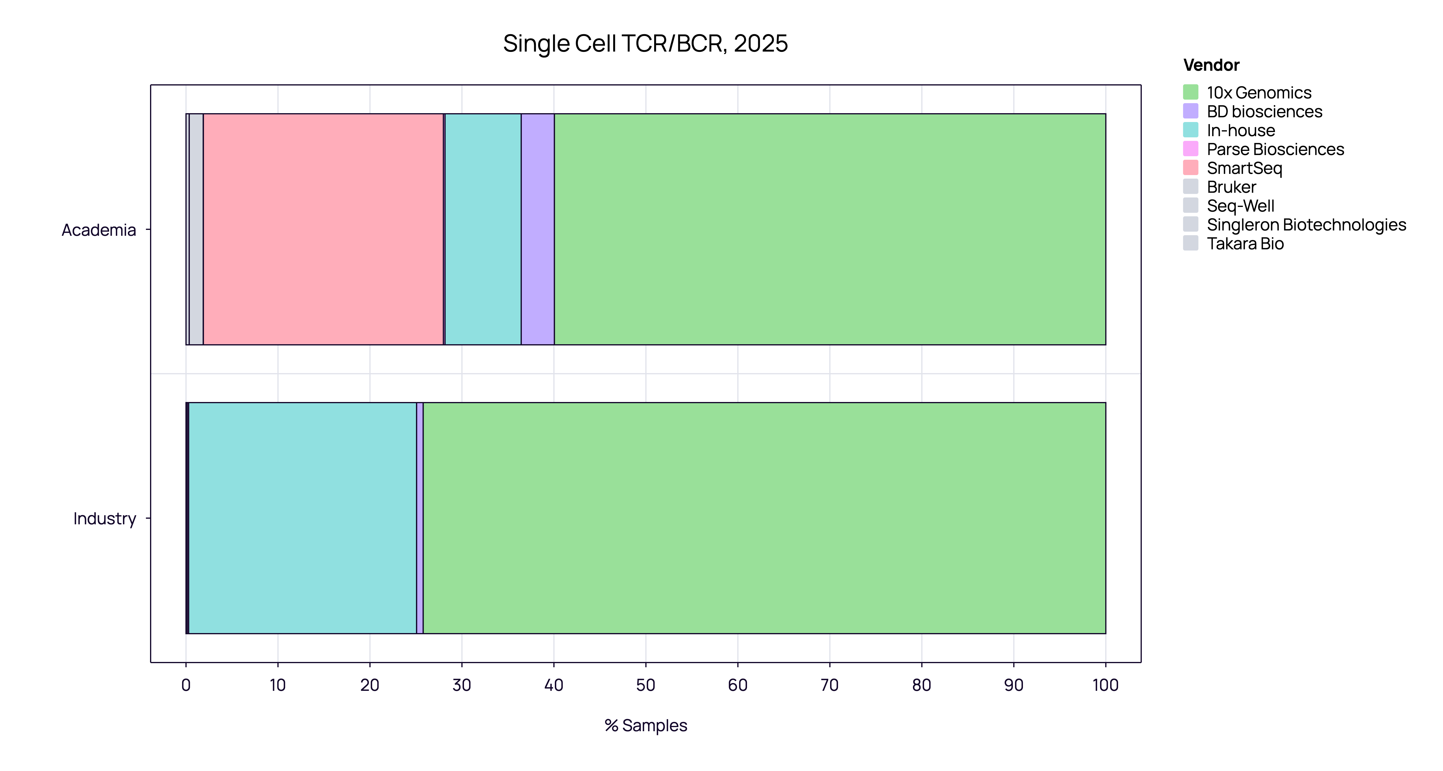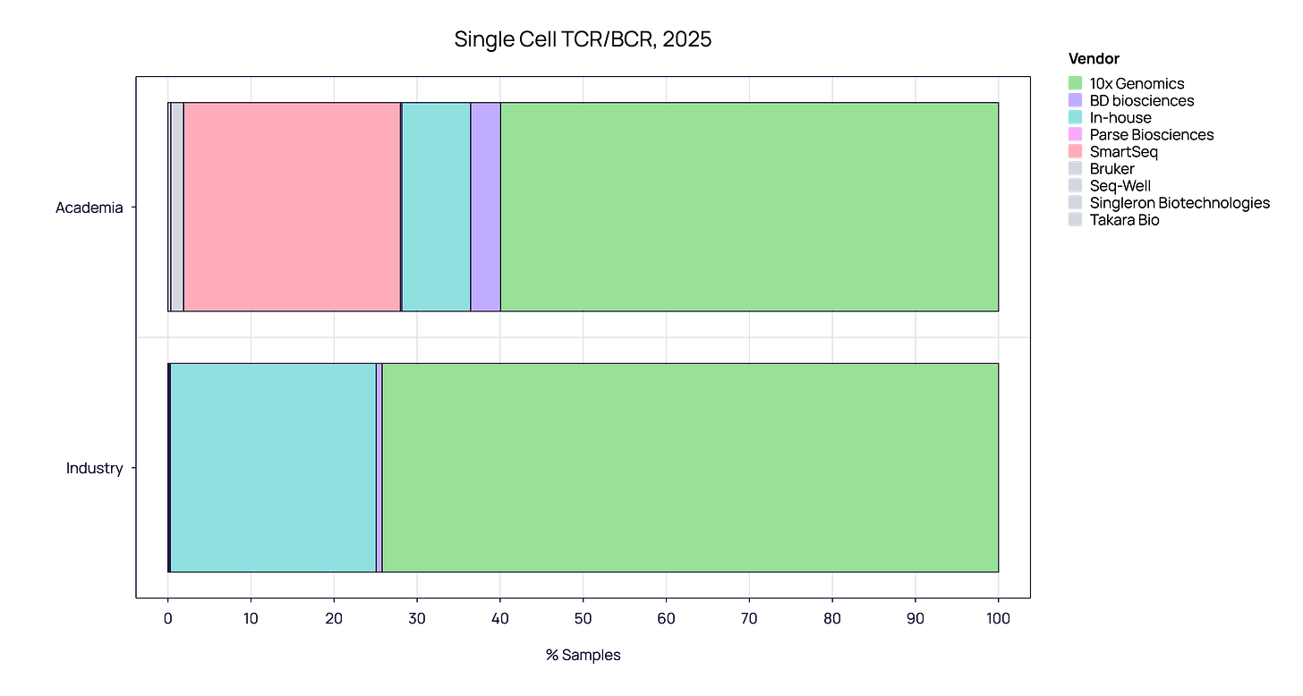 Academia - Depth and Fidelity: While Academia also favors 10x Genomics (~60%), it retains a distinct sub-market for SmartSeq (~25%), a high-fidelity method virtually absent in industry.
