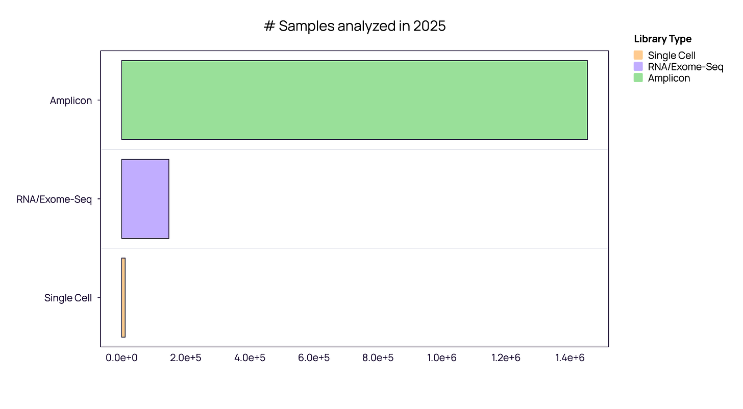 However, volume does not equal velocity. While bulk sequencing demonstrates reliable volume stability (showing 33% year-over-year growth in our dataset), single-cell adoption is accelerating, with sample volumes growing by over 50% annually.
