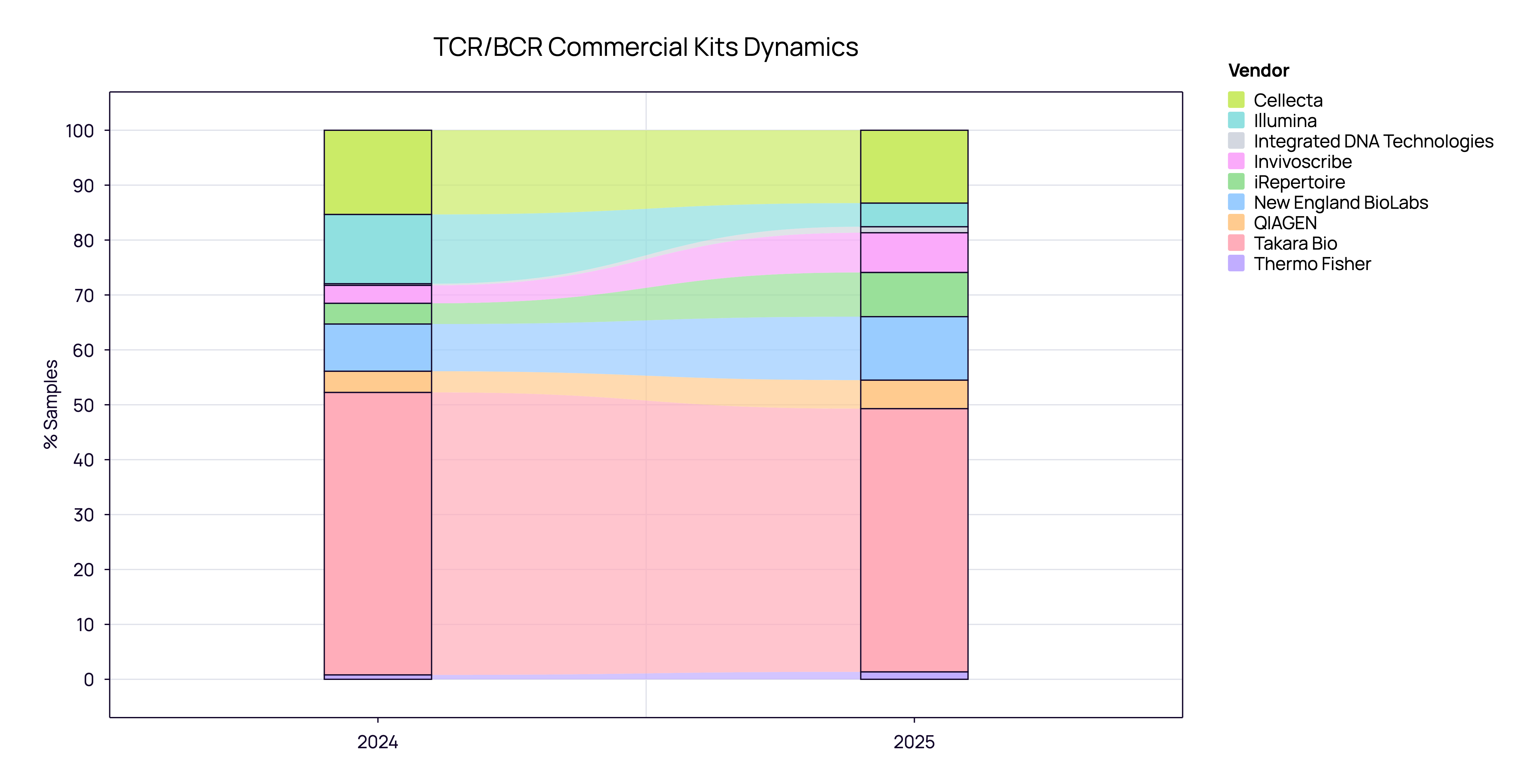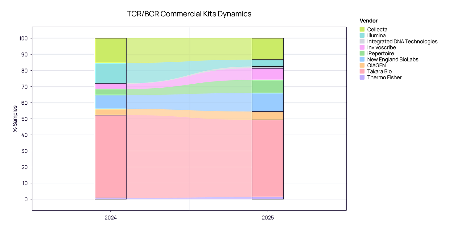 When analyzing the commercial kit landscape (aggregated TCR and BCR), we see a market that has reached maturity. The volatile “land grab” phase appears to be over, replaced by a stable hierarchy of established players.